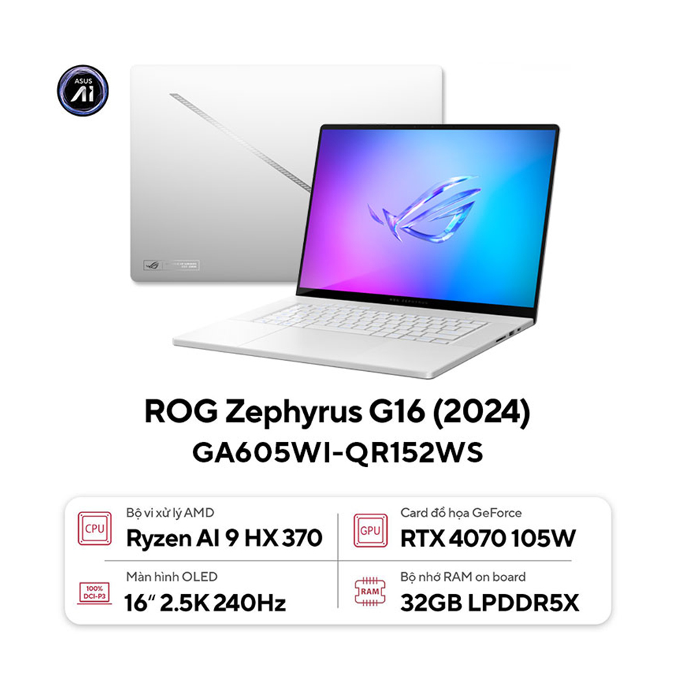 Với cấu hình mạnh mẽ, màn hình chất lượng cao và card đồ họa RTX 4070, Asus Gaming ROG Zephyrus G16 GA605WI-QR152WS là lựa chọn lý tưởng cho game thủ và người dùng làm việc sáng tạo. Máy không chỉ mang lại hiệu suất cao mà còn có thiết kế mỏng nhẹ, thời lượng pin tốt, đảm bảo sự linh hoạt trong mọi tình huống.